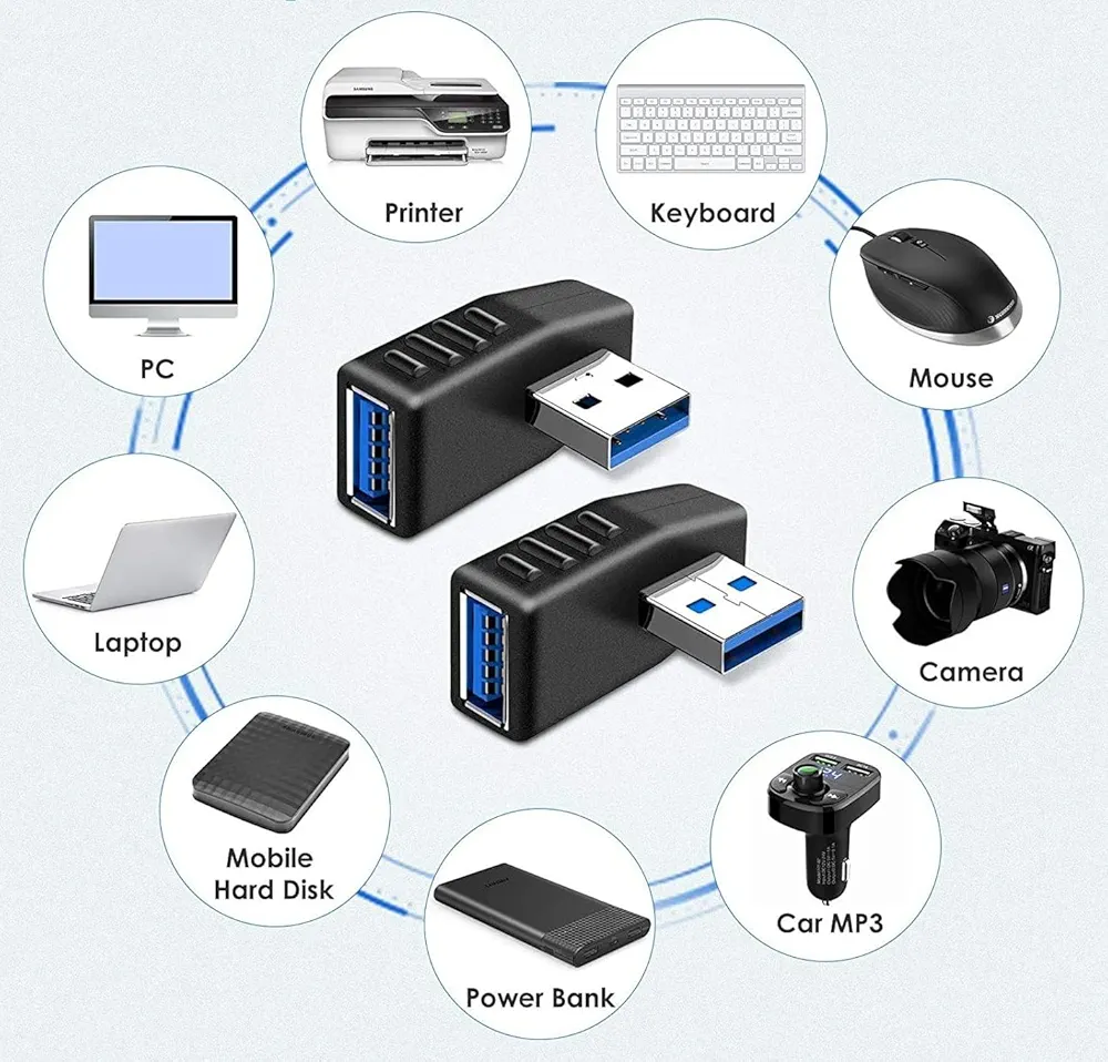 Pack of two USB 3.0 angled adapters with left-angle and right-angle connectors, designed to extend USB ports, reduce cable strain, and provide convenient connectivity for computers, laptops, and desktop devices.